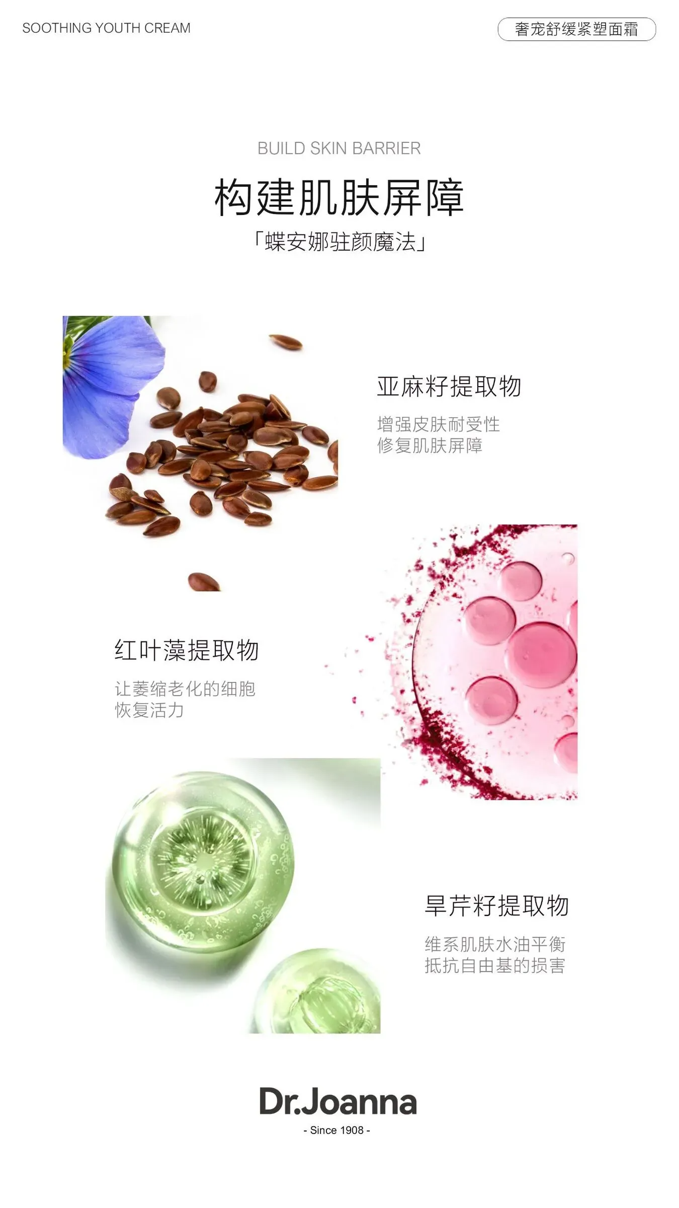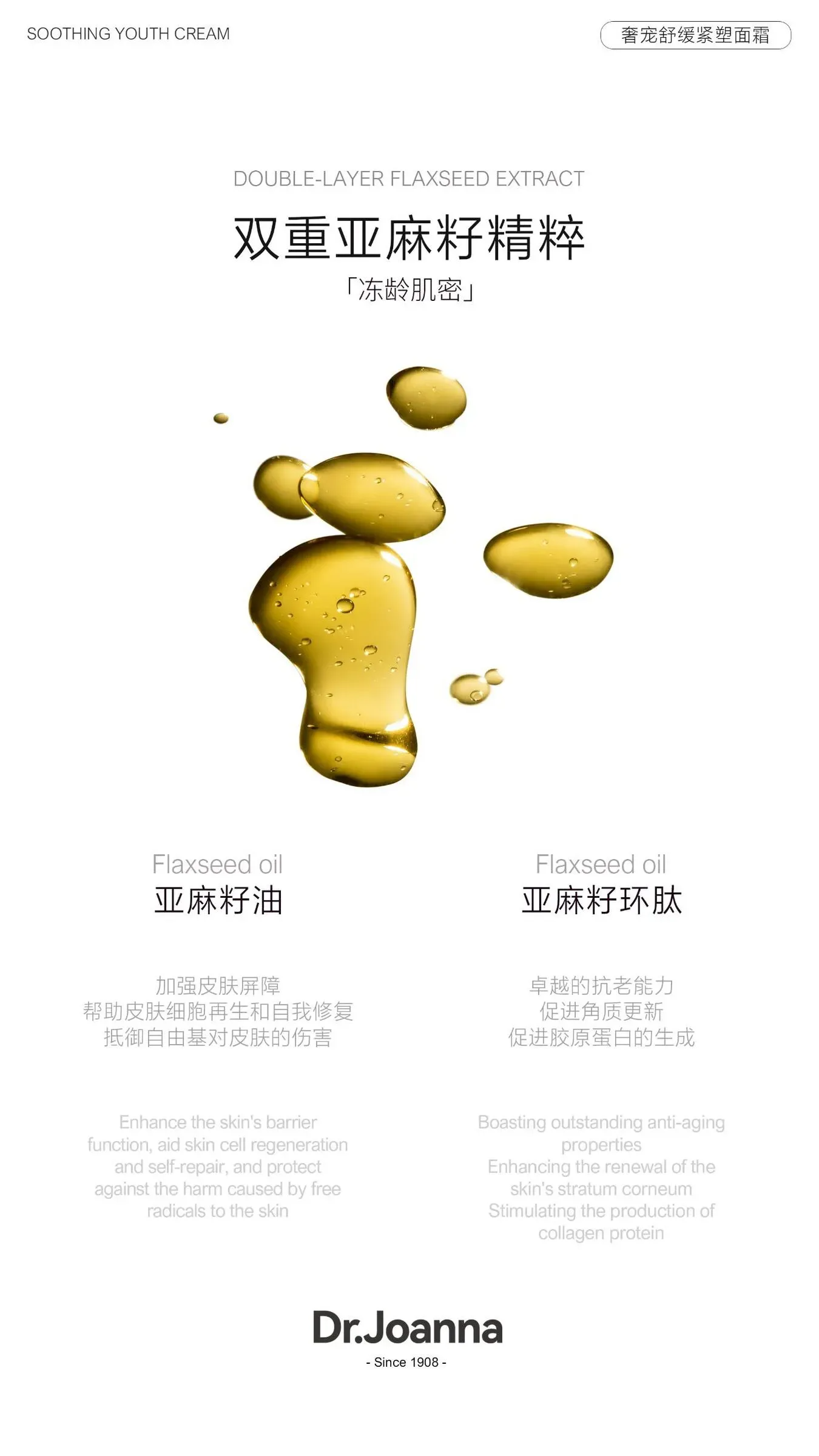 -成分:有德国的抗皱法宝,获得了七次的诺贝尔的提名,就是我们的双亚麻籽!它的优势和效果不仅仅是抗皱紧致,包括提亮、亲肤、舒缓各方面是非常显著的!